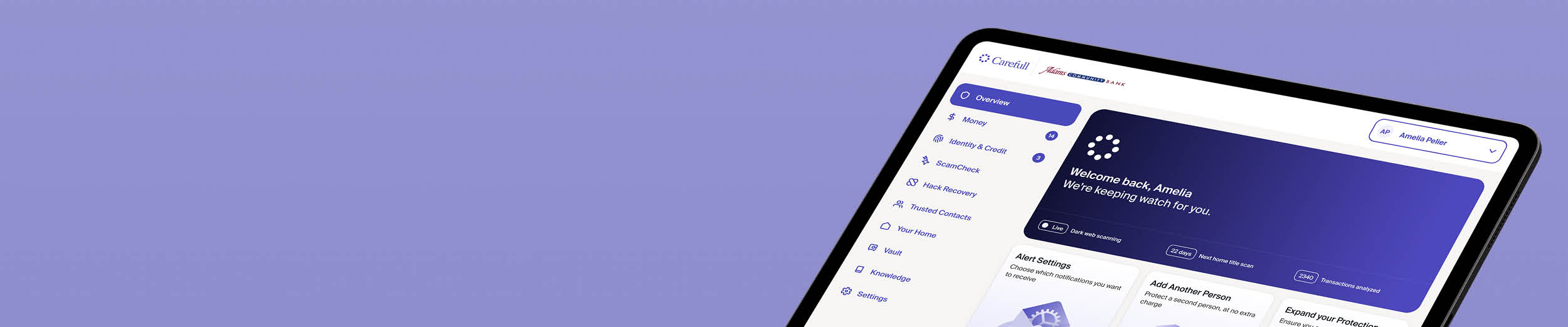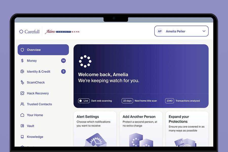 Adams Community Bank has partnered with Carefull to provide our customers with FREE1 account, credit, and identity monitoring, to protect our customers against fraud, scams, missed bills, and money mistakes.